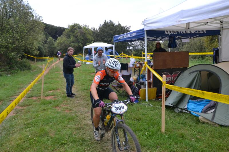 As the trail became less congested, I was able to settle into a rhythm. My feeding was working really well... Bottle one half and food the second half. This meant I could ride straight past and grab one thing as opposed to having to fumble my way through grabbing numerous things. It allowed me to carry my speed through the feedzone, which in turn, conserved a lot of energy. I was polishing off a full bottle per lap (a little over an hour), which was perfect. We had a system worked out with my food where Matteo would put the food in a plastic cup and I would tip into my mouth whatever would fit and chew it through the feedzone, then put the rest in my back pocket. Drinking would happen on the longer fire trail sections for me, and eating would happen on hill crests, where I could shove some food in my mouth and then worry about chewing it on the descents where I could have both hands on the bars and I wasn't breathing so hard so I could swallow. It was perfect. I was an eating and drinking machine on the bike and I had a really good schedule going. Later in the race, I knew I would begin to feel less inclined to do these things so well, so I made a point to get it right early in the race. You get sick of eating and drinking late in the race. Functional eating is hard work when your stomach is shrinking, you feel sick and you don't feel like eating anything that is handed to you. The thing I got wrong, which was a mistake that I was really mad at myself for, was that the portion sizes I had directed my crew to put in the cups were a bit small (it's difficult to know when you are working with foods you are unfamiliar with), so as we rode on further into the race, I slowly moved into carbohydrate deficit, a mistake that I reckon cost me a good 30minutes later on.